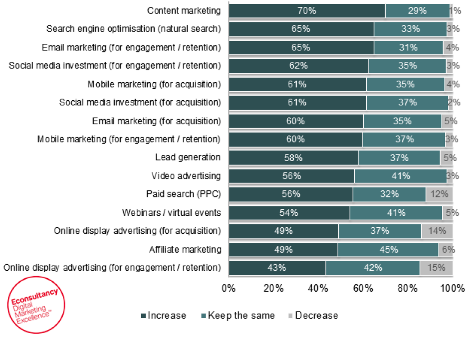 Voor het rapport vroeg Econsultancy ook naar het budget van de individuele marketingkanalen. Daaruit komt naar voren dat contentmarketing het vaakst kan rekening op een stijging in budget. 7 op de 10 bedrijven is van plan meer te investeren in contentmarketing. Ook in SEO (65 procent) en e-mailmarketing (65 procent) wordt flink meer geïnvesteerd. Sociale media komen 'pas' op de vierde plek (62 procent).