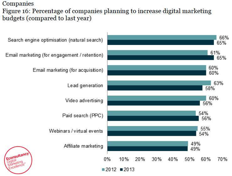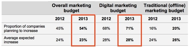 7 op de 10 bedrijven is van plan haar budget voor digitale marketing voor dit jaar te vergroten. Dat blijkt uit het Marketing Budgets 2013 rapport van Econsultancy en Responsys. Aan het rapport werkte 800 marketeers en bureaus mee. Ter vergelijking: slechts 20 procent van de respondenten geeft aan hun budget voor traditionele (offline) marketing te vergroten. De gemiddelde stijging van het digitale marketingbudget bedraagt 28 procent, dat is iets hoger dan dat voor offline budgetten (26 procent).