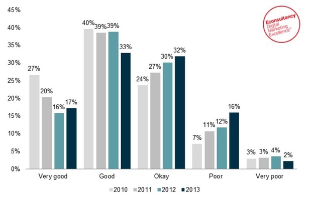 Ondanks de geplande investeringen zegt slechts de helft van de bedrijven een goede of zeer goede kennis te hebben van de ROI van digitale marketing. Vorig jaar was dit nog 55 procent. Deze daling is een voortzetting van een neergaande trend. In 2010 zei 67 procent nog goede of zeer goede kennis van de ROI te hebben.
