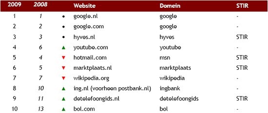 Veel websites genereren slechts een beperkt bereik. Per maand hebben circa 1.500 websites een gemiddeld bereik van meer dan 1% en alleen de top 100 websites hebben een bereik van meer dan 10%. Voor de top 500 geldt dat negen van de tien websites met het grootste gemiddeld maandbereik vorig jaar ook nu weer het grootste bereik hebben. De Telefoongids heeft nu door het samengaan met de Gouden Gids een top 10 positie verworven en Startpagina uit de top 10 van best bezochte websites verdrongen. Youtube.com heeft ondertussen een 4e positie in de ranglijst verworven en Hyves heeft van alle STIR?sites opnieuw het meeste bereik. De hoogste nieuwkomer in de ranglijst is twitter.com op positie 90. Deze site kwam in de halfjaarrapportage van 2009 binnen op positie 151 en is daarna dus nog flink doorgestegen. Andere opvallende nieuwkomers zijn bing.com en vakantieveilingen.nl. Facebook stijgt van positie 161 in 2008 naar een 35e positie in 2009.
