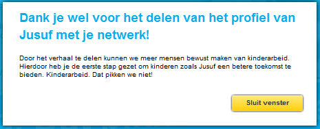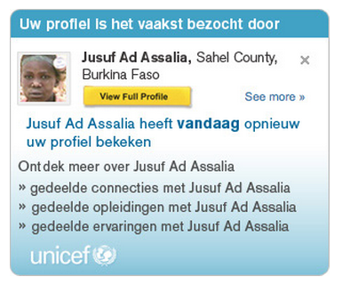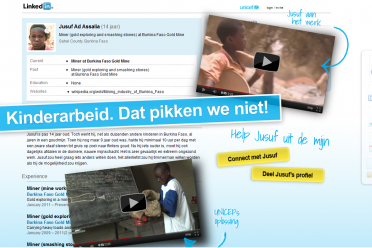 “Jusuf Ad Assalia uit Burkina Faso heeft uw profiel het meest bezocht. Ontdek meer over Jusuf.” Deze melding trok vanochtend mijn aandacht tijdens het inloggen op mijn LinkedIn account. Jusuf is 14 jaar oud, en slaat al jaren stenen kapot in een goudmijn. Nieuwsgierig als ik ben, bekijk ik het profiel van Jusuf aandachtig. Zoals verwacht verschijnt er binnen een aantal seconden een lay-over in beeld, waarin Unicef mij aanspoort om bij te dragen aan de strijd tegen kinderarbeid. Een opvallende campagne die de feiten keihard en visueel verwoord.