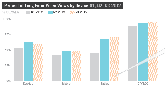 Ook uit de kwartaalcijfers van Ooyala, die John Goedegebuure onlangs op Marketingfacts blogde, blijkt dat er steeds meer kijktijd wordt besteed aan langdurige kijksessies. Bij tabletbezitters gaat 71% van hun videoconsumptie naar content van 10 minuten of langer en voor 30% van het gebruik betreft dit zelfs kijksessies van meer dan 1 uur. Voor connected-TV’s (en gameconsoles) liggen deze percentage op resp. 94% en 41%.