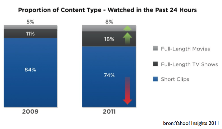 Online video was het domein van grappige korte video's die we als videosnack tussendoor keken, maar groeit nu uit tot een plaats waar ook long form content in groten getale wordt geconsumeerd. Deze trend is bijvoorbeeld te zien aan de groei in Amerika van diensten als Netflix en Hulu Plus (de Amerikaanse variant van Uitzending Gemist). Het publiek kijkt deze video's soms op tv, maar vooral vanaf het scherm van de computer, tablet of smartphone.