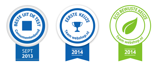 Waarborgen en nomineringen domineren e-commerce. Vooral waarborgen van partijen als de consumentenbond en tweakers.net zie je regelmatig voorbij komen en hebben een zekere autoriteit weten op te bouwen. Ze tellen voor de consument dus mee in de overweging om voor een webshop of product te kiezen. Veel bedrijven zullen met hun productaanbod echter nooit in aanmerkingen komen voor deze nomineringen. Introduceer daarom zelf een eigen nominering en plak hem op je producten.