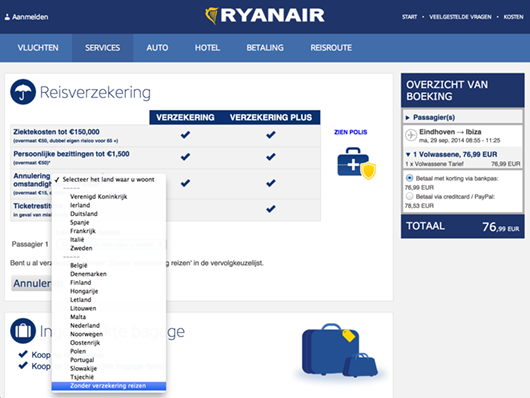 Een reis boeken bij Ryanair kan namelijk niet zonder aan te geven hoe je verzekerd wilt worden. In plaats van echter de vraag te stellen of je misschien al een doorlopende reisverzekering hebt – en dus geen verzekering bij ze af wilt sluiten – wordt de vraag gesteld in welk land je woont. ‘Zonder verzekering reizen’ vindt je onderaan in de lijst met keuzemogelijkheden.