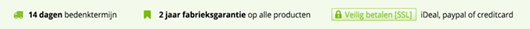 Betalingen via een betaalmethode zoals iDeal, Paypal, creditcard, Mister Cash of Sofort banking gebeuren per definitie over een versleutelde verbinding. Voor kleinere e-commerce spelers kan het aanschaffen van een EV-SSL certificaat, die je browserbalk helemaal groen kleurt – een grote kostenpost zijn. Wil je bezoekers ervan overtuigen dat betalen bij jouw webshop wel degelijk volkomen veilig is, neem dan een USP op in je ontwerp dat visueel overeenkomt met de browsermarkering van een SSL certificaat. Je roept bij bezoekers de zelfde associatie op als de implementatie van een daadwerkelijk EV-SSL certificaat.