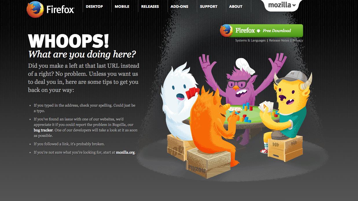 De foutpagina van Mozilla biedt de bezoeker verschillende uitwegen van de foutpagina. Het hoofdnavigatiemenu blijft behouden. Tevens gebruikt Mozilla de pagina als een mogelijkheid voor een ‘lead conversie’ door het opnemen van een directe downloadlink voor zijn browser. Dit is een fantastische manier om een dwalende bezoeker op te vrolijken.
