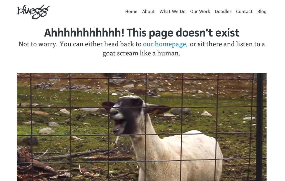 Blue Egg gebruikte dit memorabele filmpje in zijn 404 foutpagina-campagne. Door het opnemen van een stukje populaire cultuur, is deze pagina een leuke verrassing voor bezoekers. Het merk nodigt je uit om, bij wijze van excuus voor het verschijenen van de 404 foutpagina, het filmpje te bekijken. Als je daarmee klaar bent kun je terugkeren naar de homepage.