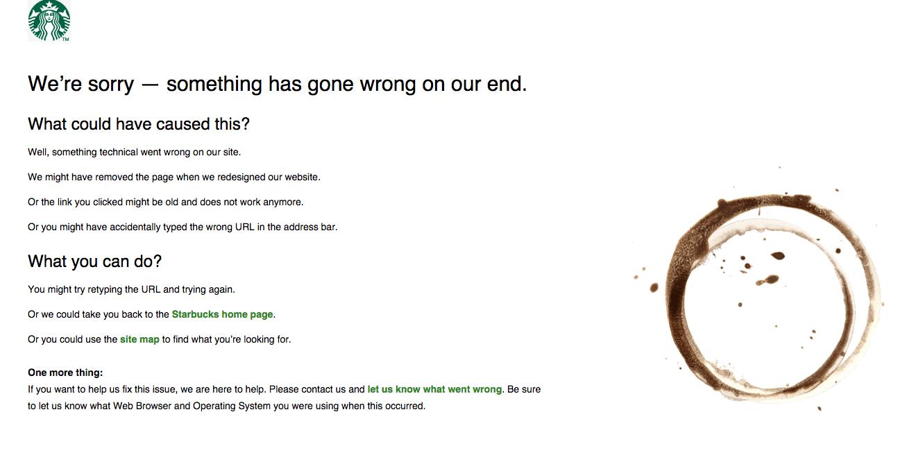 Starbucks creëerde een zeer functionele 404 pagina. Deze informeert de bezoeker wat de oorzaak van de foutpagina zou kunnenzijn. Daarnaast biedt deze de bezoeker een aantal opties voor de volgende stap. Net zoals alle goede foutpagina’s vraagt ook deze pagina ook om onmiddellijke feedback van de bezoeker.