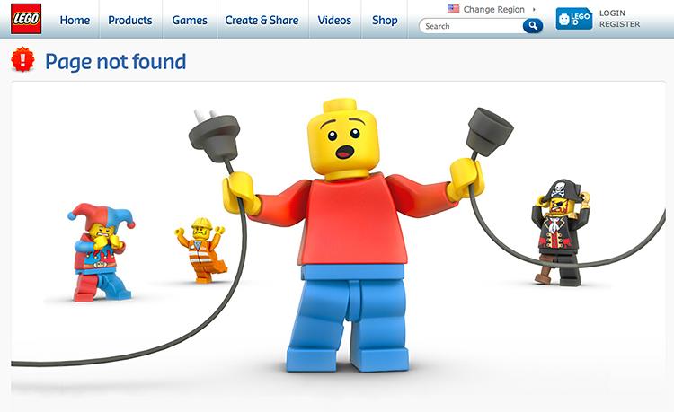 Een van de meest vooraanstaande van alle 404 pagina’s is die van Lego. Door helder beeldgebruik maken zij de bezoeker duidelijk dat hij op een gebroken link is gestuit. Door middel van hun eigen Legopoppetjes bouwt ook Lego aan brand loyalty. De verschijning van de Legopoppetjes neemt enigszins frustratie weg bij de bezoeker die wellicht zelfs moet lachen.
