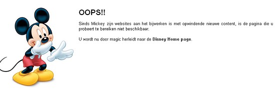 De foutpagina van Disney.nl laat een aan andere slimme toepassing van humor zien. Wie kan nou een afbeelding van Mickey Mouse of Donald Duck weerstaan? Disney.nl heeft deze, wellicht bekendste Disneyfiguren, gebruikt op hun 404 foutpagina. Door het inzetten van een bekend personage in een grappige situatie heeft ook deze website de irritatie van de bezoeker weten af te zwakken en een simpele manier geboden om terug te komen op de homepage.