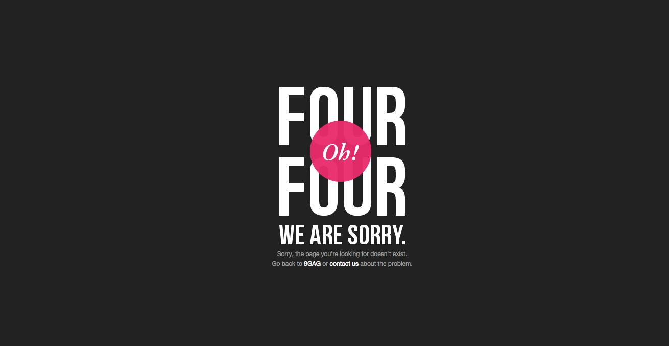 9GAG maakt gebruik van creatieve typografie en een modern kleurschema voor hun foutpagina. Deze heeft een eigenzinnige titel waaruit hun creativiteit blijkt en een knallende kleur om de pagina visueel aantrekkelijk te maken. Het ontwerp van deze pagina komt niet overeen met de rest van de site, zodat het een geweldige aandachtstrekker is.