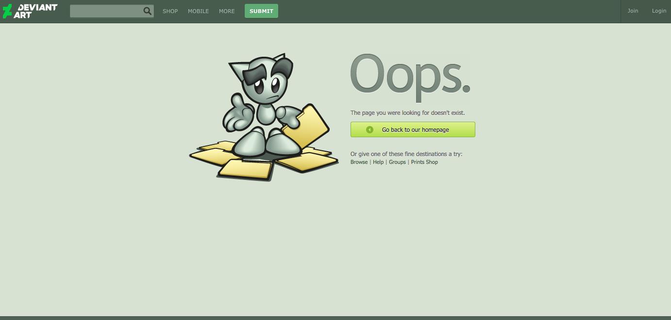 Deviant Art staat bekend om alles wat visueel en creatief is. Zijn simpele, doch effectieve, geïllustreerde foutpagina toont het mascotteachtige kenmerk van de site. Het is een creatieve manier om nadruk te leggen op de identiteit van het merk en om te laten zien dat de site begrijpt hoe de bezoeker zich voelt als hij een bestand kwijtraakt.