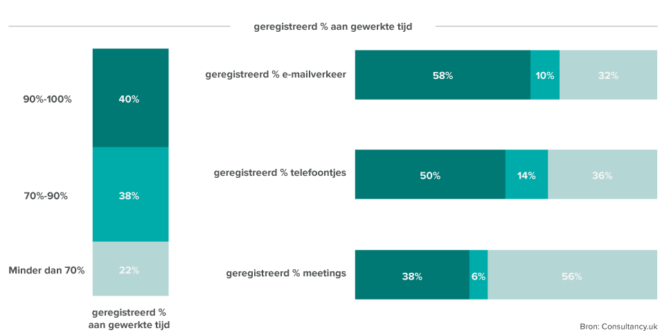 Zo registreert slechts 18 procent van de ondervraagden zijn gepresteerde uren één keer per dag. 40 procent geeft aan het een of twee keer per week te doen, en 22 procent zelfs maar een of twee keer per maand.