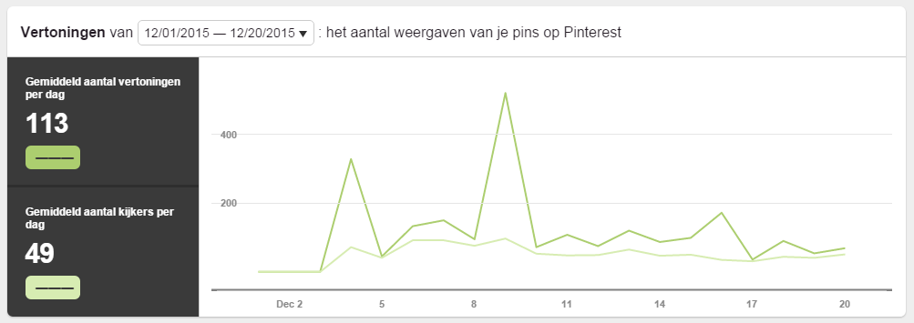 In deze Pinterest-statistieken is te zien dat op de dagen waarop veel pins zijn geplaatst, er meer vertoningen zijn gemeten.