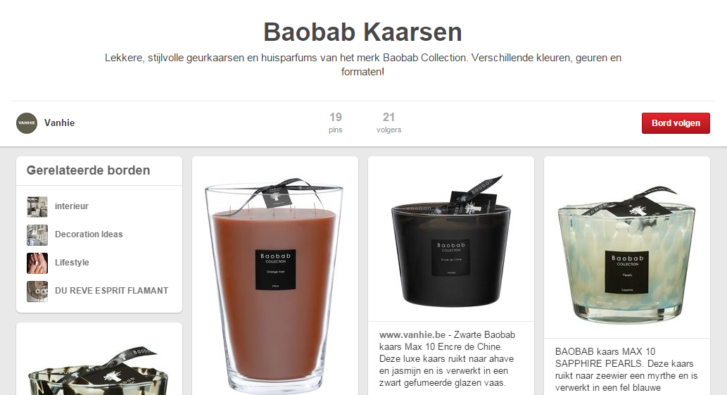 Een board met in de omschrijving de zoekwoorden ‘geurkaarsen’, ‘huisparfums, ‘Baobab Collection’.