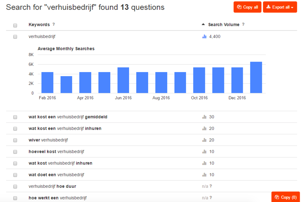 Google krijgt directe vragen van bezoekers. Iemand die zoekt op een ‘verhuisbedrijf’, kan ook vragen ‘wat kost een verhuisbedrijf?’ of ‘wat doet een verhuisbedrijf’. Aan jou de taak om in je tekst een antwoord te bieden op deze vragen.