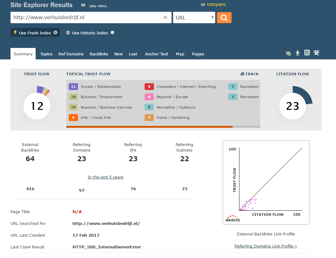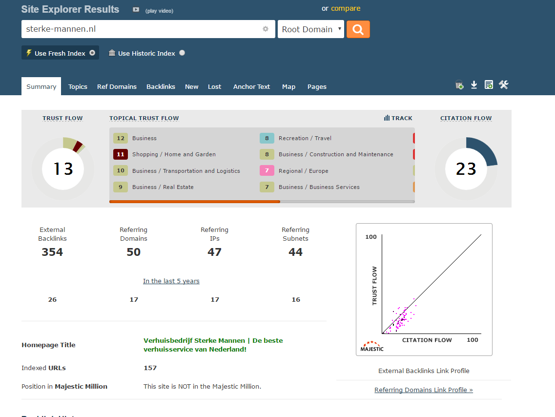 Een goede tool die hierbij gebruikt kan worden, is Majestic. De tool geeft je een categorie waar de link onder valt, alsmede een subcategorie. Alhoewel dit geen 100 procent zekerheid geeft dat Google er precies op dezelfde manier bekijkt, helpt het je wel een eind in dezelfde richting. Laten we eens kijken naar www.verhuisbedrijf.nl. Zoals je hieronder kunt zien, bestaat deze websites uit een aantal topics. Deze lijken alleen niet echt overeen te komen met waar een verhuisbedrijf voor zou moeten staan.