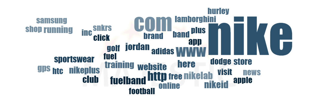 Het belangrijkste onderdeel is je merknaam. Een groot gedeelte van je anchorteksten moet uit je merknaam bestaan, wil het natuurlijk ogen voor Google. Een mooi voorbeeld hiervan is Nike. Zoals je in de wordcloud hieronder kunt zien, bestaat het grootste gedeelte van hun anchorteksten uit hun merknaam.