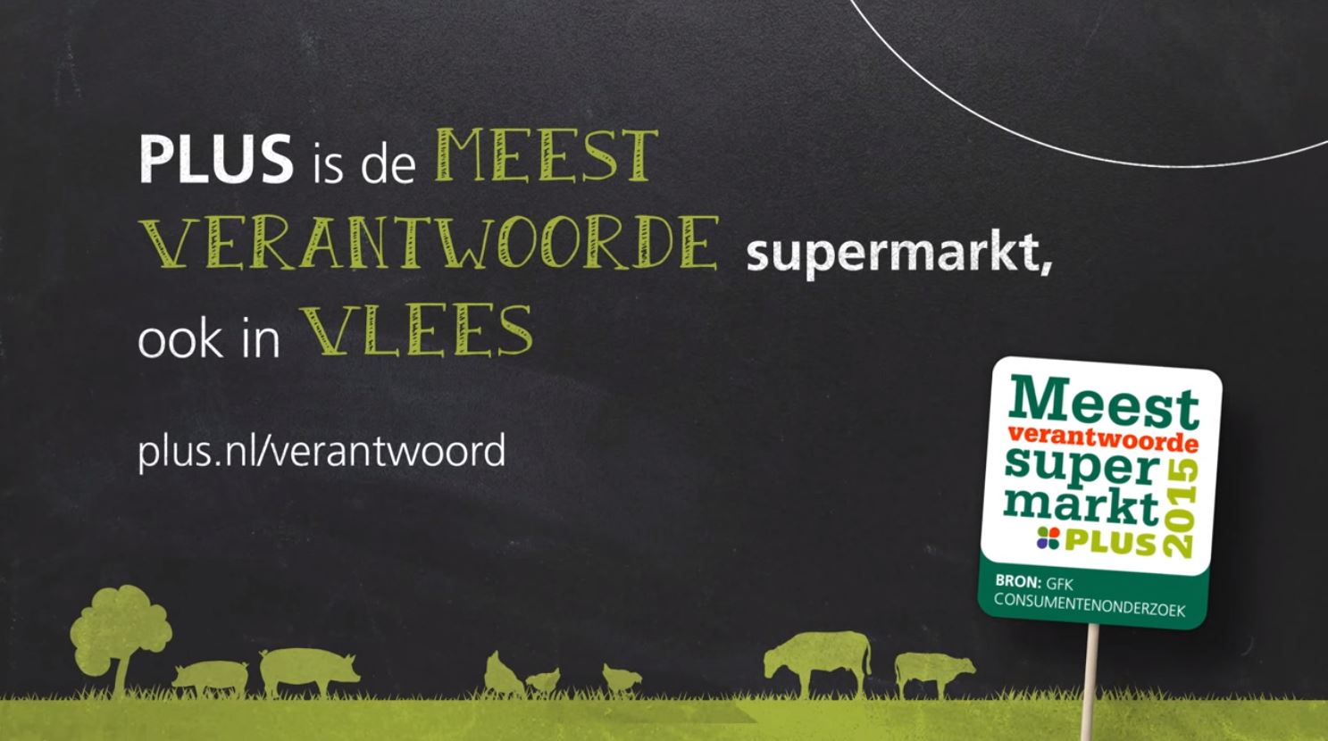 Plus wil hiermee de kritische factor van de kijkers uitzetten. ‘Ik zit naar een commerciële uiting te kijken dus ik moet oppassen wat ik geloof’, wordt uitgeschakeld door het GFK Consumentenonderzoek te noemen als externe bron. De boodschap die dan via de quote langs de kritische factor sluipt is: “Meest verantwoorde supermarkt 2015”.