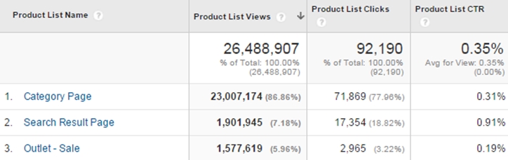 Veel bezoekers komen op een productpagina via een productlist; bijvoorbeeld een categoriepagina, zoekresultaten, de homepage of een aanbiedingenpagina. Met enhanced ecommerce krijg je de beschikking over de effectiviteit van die listings. Hoe vaak verschijnt een product in een list, wat is de doorklikratio en tot hoeveel aankopen leidt dat? Hiermee kun je dus zien hoe effectief de presentatie in de listing is en of er issues zijn. Bij welke producten is de doorklikratio laag? Of, ook interessant, welke producten verschijnen nooit in een listing?