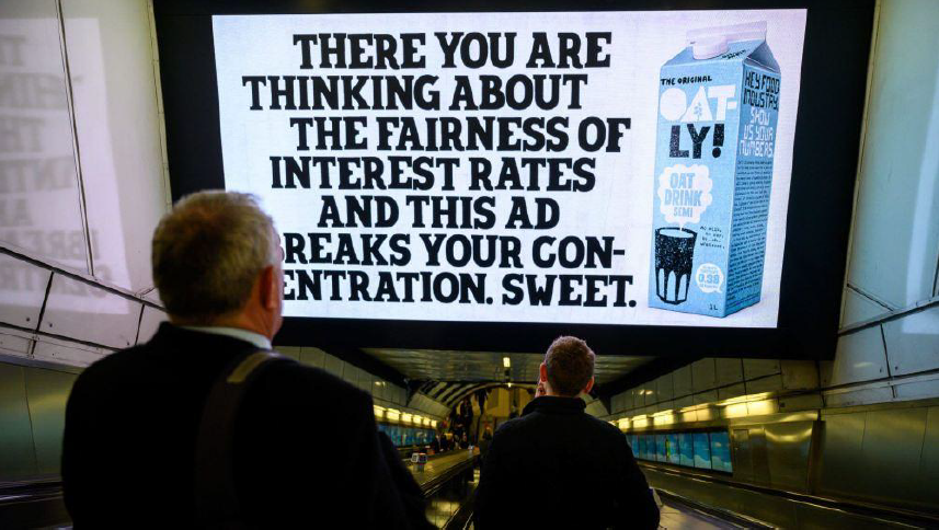Afbeelding: Ondanks dat Oatlys buitenreclame veel tekst bevat, houden zij rekening met de tijd die nodig is om dat te verwerken en voegen ze een prominente product foto erbij om het merk- & product bewustzijn te maximaliseren. Bron: JCDecaux.