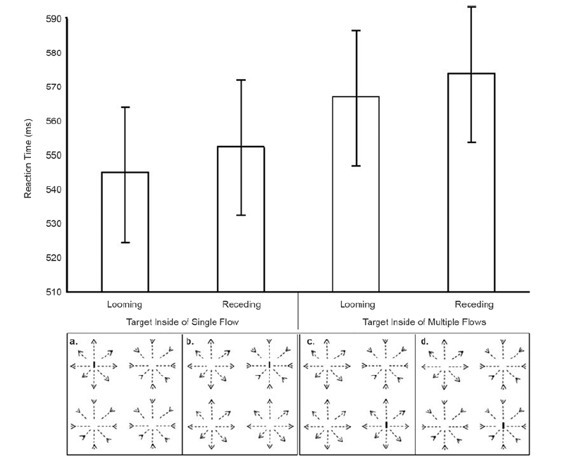 Afbeelding: Resultaten van een experiment met looming en receding animaties. De reactietijd in milliseconden is het kortst bij looming motions. Bron: Joaquim Carlos Rossini.