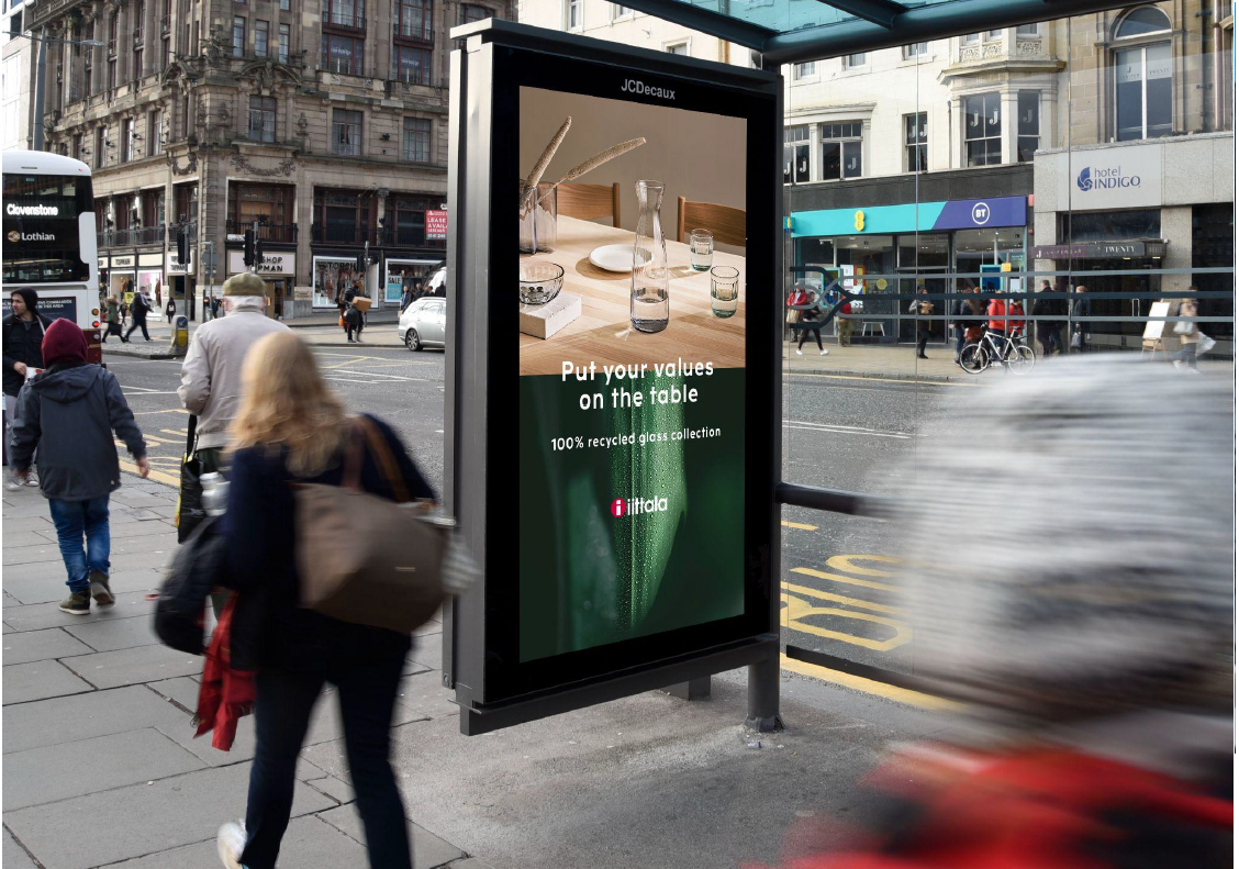 Biedt de merkstijl handleiding helaas geen oplossing voor het gebruik van opmerkzame kleuren? Speel dan met een kleurcontrast binnen het canvas van je uiting door twee verschillende kleur(beelden) bij elkaar te plaatsen. Zoals Iittala doet deze feestdagen. Ook door een scherp contrast binnen één vlak aan te brengen, vergroot je de kans dat je advertentie wordt opgemerkt.