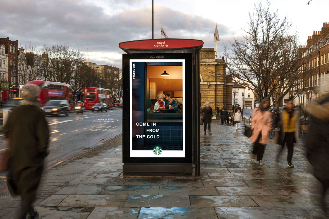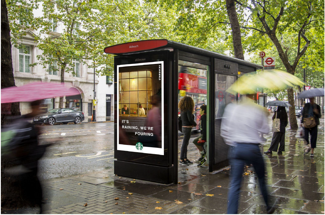 Afbeelding (boven en onder): Starbucks stemde de boodschap en afbeelding van de campagne aan op basis van de weersomstandigheid op dat moment en op die locatie. Bron: JCDecaux.