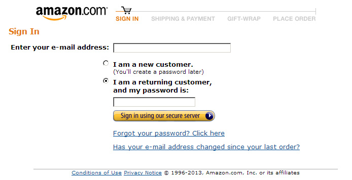 Om een verlaten winkelwagen-e-mail te kunnen versturen, moet in ieder geval het e-mailadres van de bezoeker bekend zijn. Belangrijk is dus om deze bij de eerste stap in het afrekenproces op te vragen. Bij ’s werelds grootste webshop Amazon.com doen ze dat feilloos. In de screenshot is de eerste stap van het afrekenproces te zien waarin enkel om een e-mailadres gevraagd wordt.