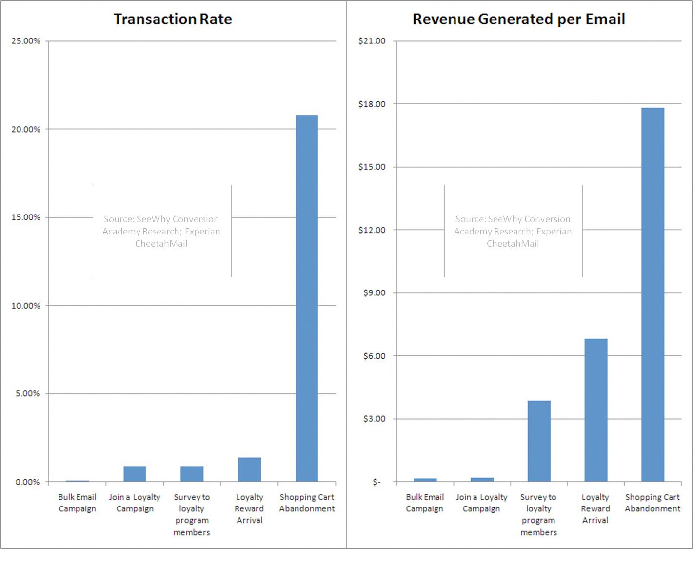 Uit Amerikaans onderzoek blijkt dat het versturen van een ‘verlaten winkelwagen-e-mail’ resulteert in een gemiddeld conversiepercentage van 20.8% en een gemiddelde omzet van 13,50 euro per verzonden e-mail. (Klik op onderstaande grafiek voor een grote weergave.)