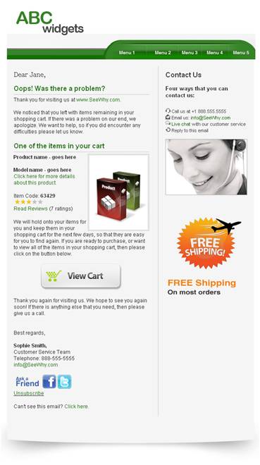 Het is belangrijk dat uit de verlaten winkelwagen-e-mail duidelijk blijkt dat het een ander type e-mail betreft dan de standaard HTML-nieuwsbrieven die je verstuurt. De e-mail moet met name servicegericht zijn en superrelevant voor de ontvanger. In feite wordt er 1-op-1 gecommuniceerd.