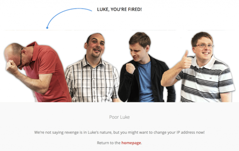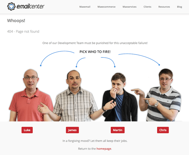 Neem daarnaast ook de verantwoordelijkheid voor de error en wijs nooit naar de bezoeker als ‘schuldige’ Door de verantwoordelijkheid te nemen, creëer je waardering en motiveer je de bezoeker om door te blijven zoeken. Hieronder een extreem, maar grappig voorbeeld van Emailcenter.com dat zichzelf verantwoordelijk houdt voor de error. Wie zou jij ontslaan?