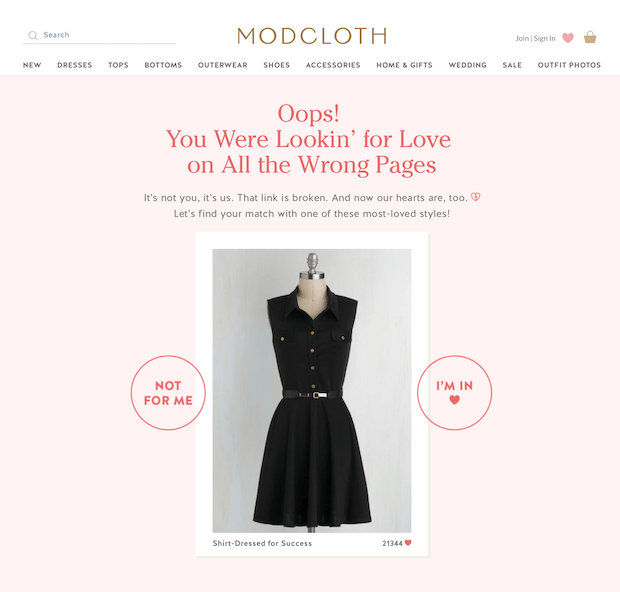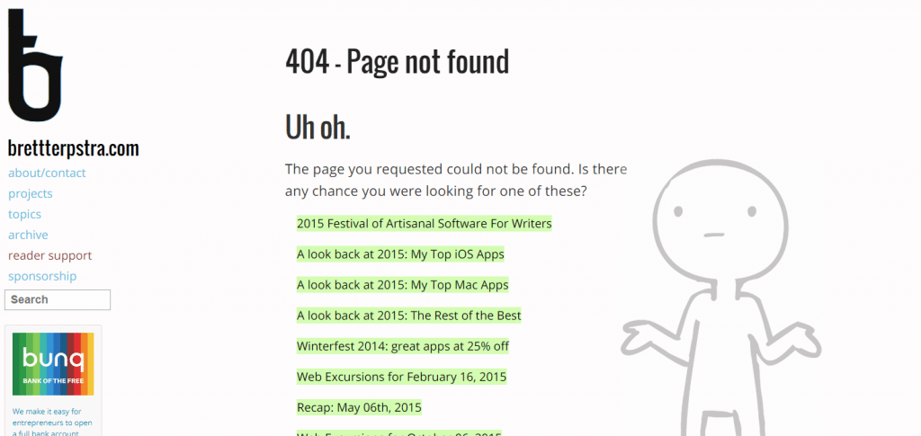Het belangrijkste advies als het gaat om 404 pagina’s, is om bezoekers direct een passende oplossing te bieden. De meest frustrerende 404-pagina’s, zijn degenen die lijken op een doodlopende weg: ‘De pagina die u zoekt bestaat niet.’ Oké, en nu?