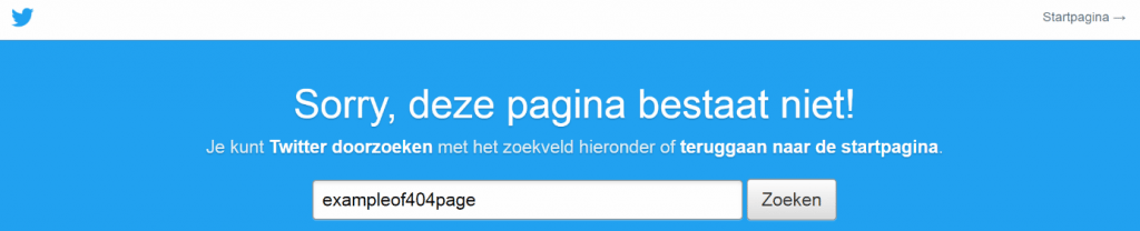 Integreer de zoekfunctie, de navigatie en/of een link naar de sitemap op de 404-pagina, zodat bezoekers verder kunnen zoeken naar de gewenste pagina. Twitter plaatst in dit voorbeeld de zoekbalk op de 404-pagina waar de verkeerd getypte link al is ingevuld.