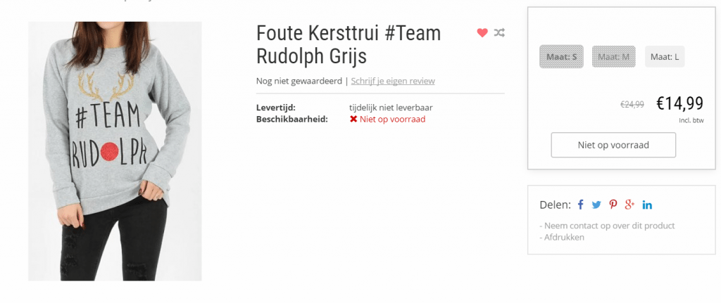 Kerst is in aantocht en je wil natuurlijk niet de enige zijn zonder foute kersttrui. In het voorbeeld hieronder wordt de boodschap gebracht dat de kersttrui die je zo graag wilde niet meer beschikbaar is in jouw maat. Punt. ‘Laat maar zitten’, denk je dan. Je verlaat de website en kijkt verder.