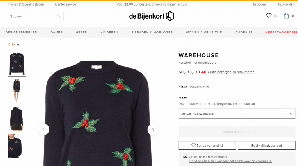 De Bijenkorf zet twee best practices in: ze bieden bezoekers de mogelijkheid om informatie te ontvangen zodra het product weer op voorraad is en maken ook de winkelvoorraad inzichtelijk.