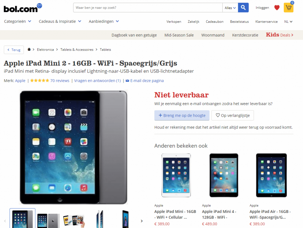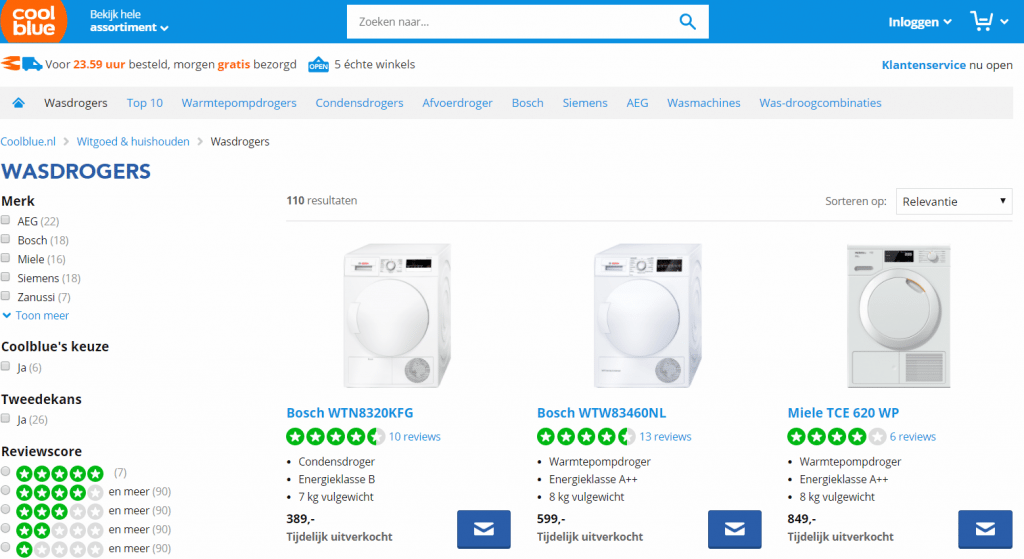 Coolblue vermeldt in onderstaand voorbeeld welke producten tijdelijk uitverkocht zijn en geeft bezoekers ook direct de mogelijkheid zich aan te melden om een melding te ontvangen zodra het product wel voorradig is.