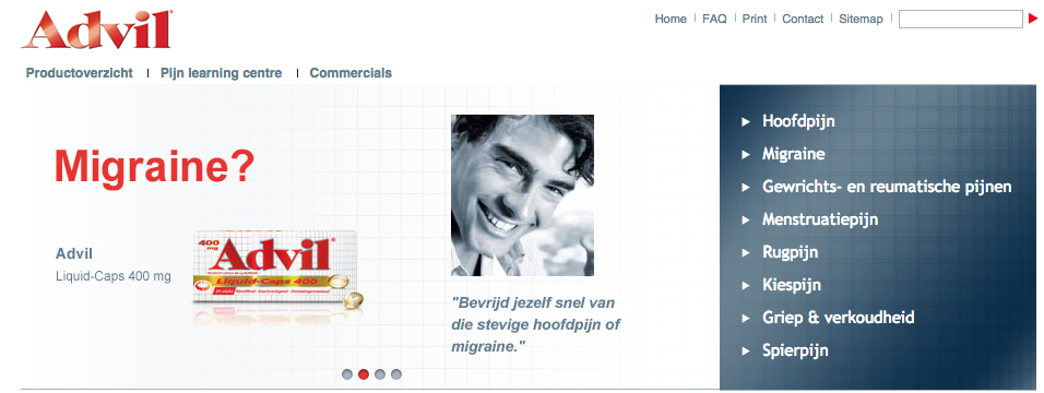 Advil lijkt de bezoeker via de website te willen voorzien van medische informatie en productinformatie. Op de homepage staat aan de rechterkant (zie afbeelding) een aantal ziektebeelden/klachten die van belang zijn voor Advil. De klachten worden op de verschillende pagina’s toegelicht, waarbij de ‘PijnCoach’ een product van Advil adviseert. Op een klachtpagina kan vervolgens doorgeklikt worden naar een productpagina met informatie en een bijbehorende bijsluiter. Elk product wordt duidelijk en overzichtelijk gepresenteerd.