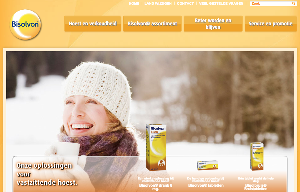 Bisolvon.nl lijkt ondanks dat de site niet responsive is, een vrij moderne website. Er wordt gebruikgemaakt van een groot breed beeld en de producten zijn duidelijk afgebeeld. De homepage is niet te druk, wat de overzichtelijkheid ten goede komt. De navigatie is prima, ik vind eenvoudig wat ik zoek. De kopjes in de menubalk vind ik echter onlogisch. Wat ik bij ‘service en promotie’ moet verwachten is mij niet in één oogopslag duidelijk en ook weet ik niet direct wat een kopje als ‘beter worden en beter blijven’ mij zal bieden.