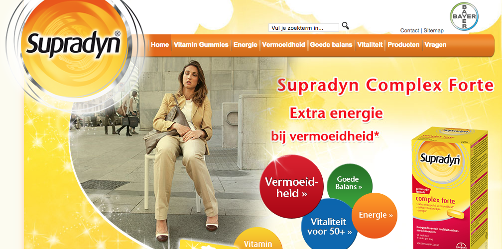 De homepage van Supradyn.nl is nogal druk. Sommige onderwerpen uit het menu worden drie keer herhaald en de tekst is klein en niet prettig leesbaar. Mocht Bayer van Supradyn.nl een kwalitatief hoge en moderne website willen maken, dan moet er zeker nog het een en het ander gebeuren. De website lijkt al lang niet te zijn bijgewerkt. Dit is zonde, aangezien een actuele website veel toegevoegde waarde voor de doelgroep kan bieden en beter scoort in zoekmachines.
