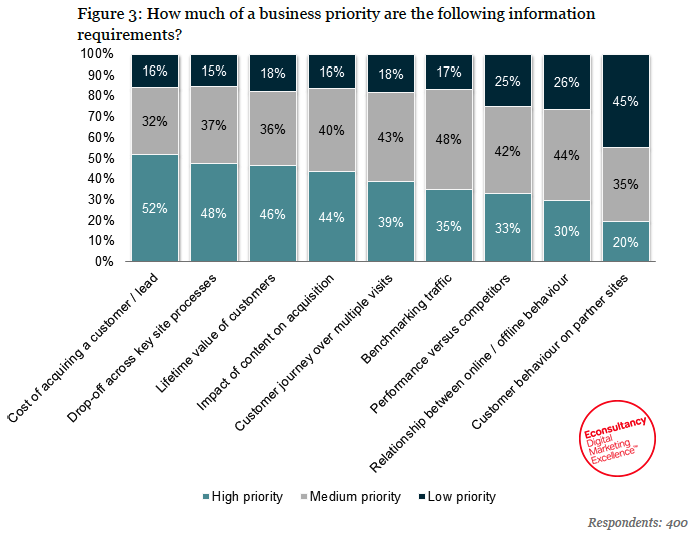 Als we het verhaal kantelen zien we dat bedrijven de meeste behoefte hebben aan inzicht in de kosten van het acquireren van een lead of klant. Inzicht in de customer journey lijkt nog niet heel hoog op de agenda te staan. Het aandeel van de repondenten dat zegt dat klantgedrag zeer belangrijk is, is wel met 4 procent toegenomen ten opzichte van vorig jaar.