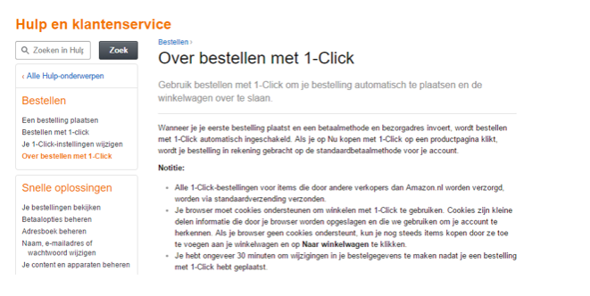 Amazon staat bekend om een hoog percentage herhaalaankopen. Een grote diversiteit binnen het assortiment en het bestellen gaat heel gemakkelijk. Ze maken het dan ook zo simpel mogelijk om als (herhaal)bezoeker een order te plaatsen. Bijvoorbeeld door bestellen met 1-Click mogelijk te maken: