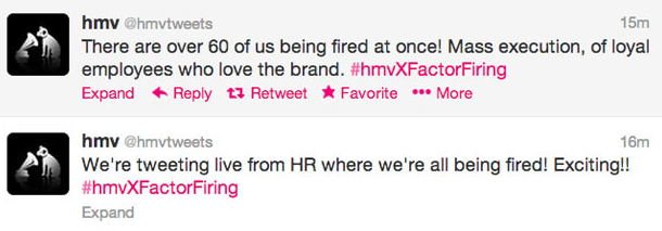 Onlangs werd bekend dat HMV flink moest snijden in personeel. De Engelse retailer van entertainmentproducten kon nauwelijks het hoofd boven water houden. Massale ontslagen waren onvermijdelijk. Wat HMV niet had voorzien was dat één van de ontslagen personen, social media-planner Poppy Rose Cleere, nog toegang had tot het HMV Twitter-account.