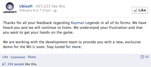 Op 28 februari stond de release van de nieuwe Wii U-game Rayman Legends gepland. Twee weken voor de release werd de deze voor een tweede keer uitgesteld met 6 maanden. Het is niet ongewoon dat dit gebeurt in de gamesindustrie, maar tegelijkertijd werd ook aangekondigd dat de game multi-platform (Playstation 3 & Xbox 360) uitgebracht wordt – wat eigenlijk de reden was waarom de game 6 maanden uitgesteld werd. Fans van de serie waren woedend en klaagden bij Ubisoft. Zij dreigde zelfs de game te boycotten. Ontwikkelaar Ubisoft Montpellier baalde enorm van de beslissing van moederbedrijf Ubisoft.