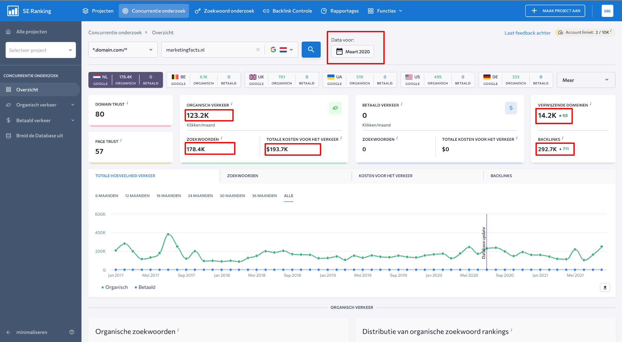In de Competitive Research tool van SE Ranking kun je veel SEO-inzichten krijgen over het verleden. Zo kun je bijvoorbeeld teruggaan tot maart 2020. Uiteraard worden de tools elke maand bijgewerkt met een set gegevens van de vorige maand.