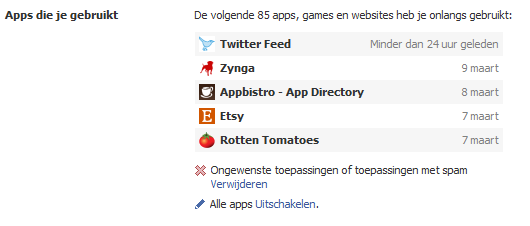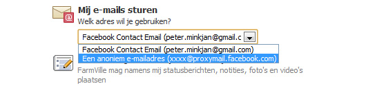 Ga dus na welke applicaties je gebruikt en verwijder alle toepassingen die je niet meer gebruikt of die je niet herkent. Je zult versteld staan hoeveel applicaties je gaandeweg als gebruiker installeert. Tijd voor een grote schoonmaak en bedenk je in de toekomst welke applicaties je toegang wilt geven tot jouw gegevens. Mocht je per ongeluk een applicatie verwijderen die je toch nog gebruikt, dan heb je deze met een paar klikken weer geïnstalleerd. Bij het installeren van apps kun je er trouwens ook voor kiezen om een anoniem e-mailadres te gebruiken i.p.v. je eigen (zie het voorbeeld van Farmville). Op deze manier voorkom je dat de eigenaar van de applicatie je e-mails kan sturen.