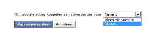 Facebook geeft geen persoonlijke gegevens (waaronder naam, profielfoto of andere foto’s) door aan adverteerders. Op dit moment geven ze toepassingen van derden en advertentienetwerken ook geen toestemming om namen of foto’s in advertenties te gebruiken. Waarschijnlijk hebben ze wel plannen om dit in de toekomst te doen, want je kan nu al aangeven of je hier toestemming voor geeft. Standaard staat het ingesteld op ‘alleen vrienden’, maar je kunt er ook voor kiezen om dit voor niemand weer te geven.