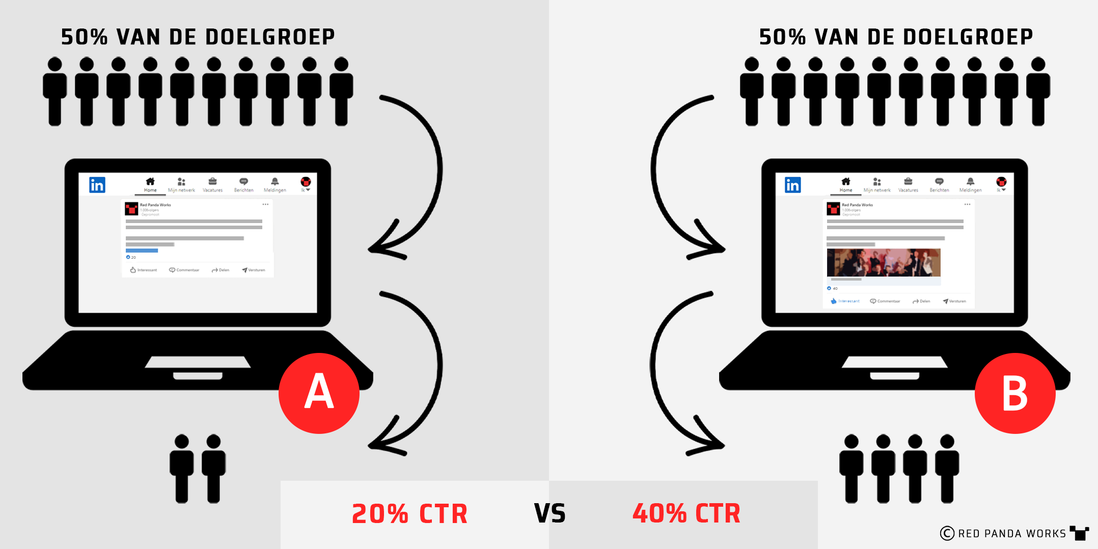 Laten we even het voorbeeld pakken van het optuigen van een LinkedIn Ads campagne. Je uiteindelijke doel is om meer bezoekers naar je website te trekken. Dit betekent dus dat je Click Through Rate omhoog moet. Om dit te gaan testen kan je het best werken volgens de A/B test werkwijze. Hierbij schotel je aan de helft van de mensen bijvoorbeeld een bericht voor met veel informatie, terwijl je de rest van de doelgroep bedient met een kort to-the-point bericht met een afbeelding.