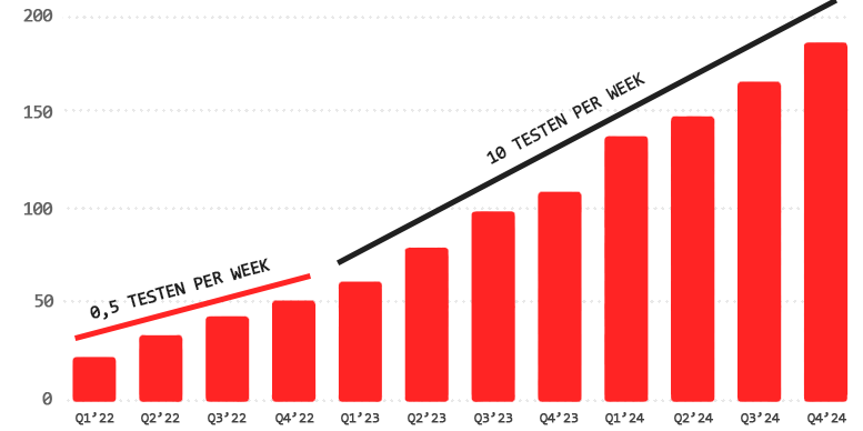 Testen staat aan de basis van de groei van elk bedrijf. Verander eens de grootte of kleur van een CTA-knop. Test verschillende social proof boodschappen op je website. Of zet eens YouTube of TikTok ads in. Het is belangrijk om vooraf hypotheses op te stellen voor de experimenten. Zo kun je de resultaten van je tests evalueren, kun je bijsturen waar nodig en kun je aan de hand hiervan je experimenten optimaliseren. Volgens meerdere hypothese onderzoeken is het aantal experimenten dat per week wordt uitgevoerd recht evenredig aan de groeisnelheid van een bedrijf. Als je dus 0,5 test per week uit zou voeren, zou je exponentieel veel minder hard groeien dan wanneer je 10 testen op weekbasis uit zou voeren. Laat staan wanneer je honderden experimenten zou volbrengen.